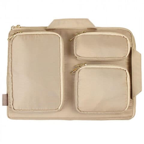 | 縦横の持ち手で好きなように持ち歩け、リュックでもトートバッグでも収納しやすい形状となっています。3つのポケットにはコード類や周辺機器が収納でき便利!内側にはA4サイズが収納できるポケット付き。 |