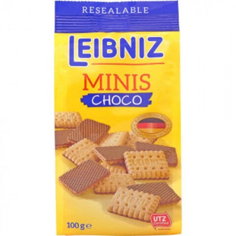 | ライプニッツミニーズビスケットの片面にミルクチョコレートをコーティングしました。小さくてもチョコレートとバターの味は本物です。 |