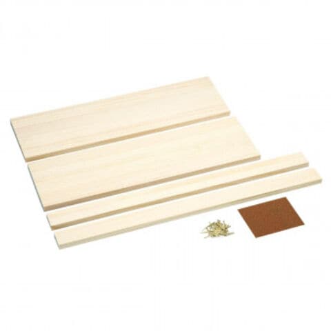 | セット内容 | 板材(ラジアタパイン集成材)(510×150×15mm)×2、板材(ラジアタパイン集成材)(600×40×15mm)×2、真鍮メッキ釘(N-32)×40、説明書(作例図面8種類付)×1、不織布保管袋×1、サンドペーパー×1 |