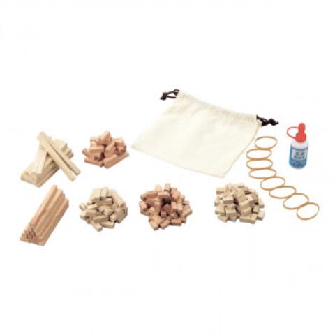 | セット内容 | 木片(大)(赤・白×各15)×30、木片(中)(赤・白×各40)×80、木片(小)(赤・白×各60)×120、輪ゴム×8、木工接着剤×1 |