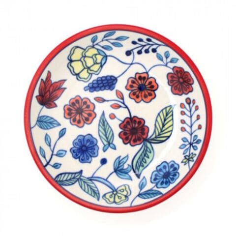 ひとつひとつが手描きの素朴な味わいの中にインドらしいカラフルでエキゾチックな柄と色で食卓が彩ります。
