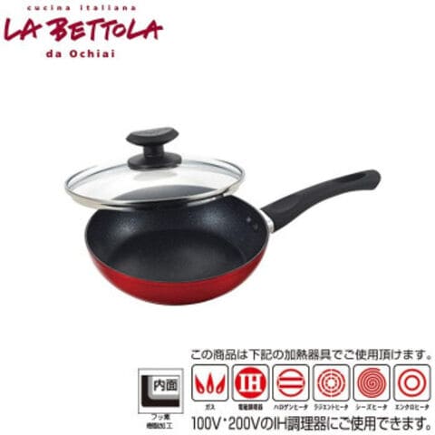 | 素材・材質 | フライパン/外面:焼付け塗装(底面を除く)、内面:フッ素樹脂塗膜加工、本体:アルミニウム合金、はり底:ステンレス鋼(クロム18%)(底の厚さ2.7mm(はり底を含む))、ハンドル:フェノール樹脂(シリコン塗装) フタ/強化ガラス、フタ金属部:ステンレス鋼、ツマミ:フェノール樹脂(耐熱温度140度) |