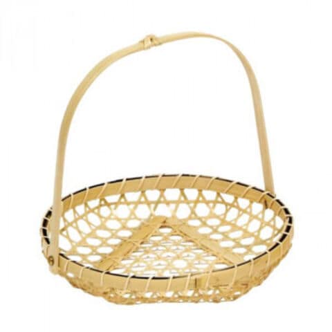 | 六ツ目編みの手付かごは斜め編みを交えることで、軽さと頑丈なつくりが特徴です。竹の風合いが様々なシーンで食膳を彩ります。 |