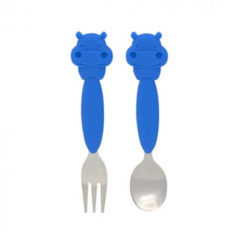 | カラフルなスプーンとフォークです。シリコン製で持ちやすいグリップです。食べ物をしっかりキャッチする先端を丸めたフォークは、子ども達の為に安全に設計されています。 |
