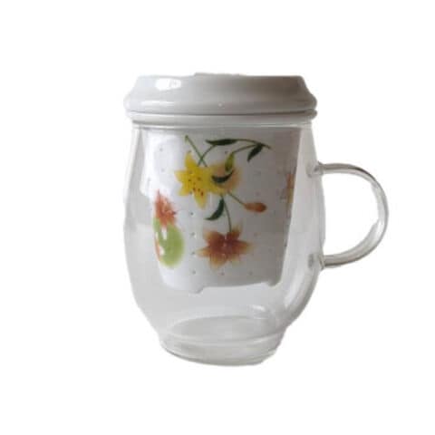 ガラスのマグカップとセラミックの茶こし。ガラスのマグカップに陶磁器の茶漉しと蓋をセットしました。茶漉しに茶葉をいれお湯を注いで蓋をしてしばし待ち、いい色にお茶が出たら茶漉しをはずして、そのまま飲めます。ガラスごしにお茶の濃さが見えるから、少しの量でも濃くなりすぎる事はありません。ガラスのマグカップは耐熱ガラス。ギフトにも最適。ガラスのマグカップの中に、かわいい柄が浮かびます。