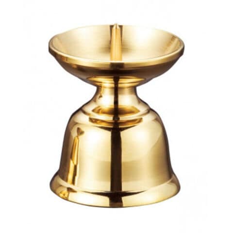 | 小型仏壇に祀る仏具として、脚を無くし、皿と土台がくっついたような形にして、背を低く作った蝋燭立てです。 高さが限られる箱宮などの神棚や小さな地蔵堂などで通常の脚付き火立とロウソクを使用すると、火が屋根を炙って焦がしてしまったり、戸帳や幕に燃え移っての火事の心配がありますが、そういった場合にこのダルマ火立を使用すると高さが抑えられ、屋根やお飾りに火が触れる可能性が少なくなるため、狭い場所や小さな箱檀、御厨子用として宗派を問わず用いられてます。 |