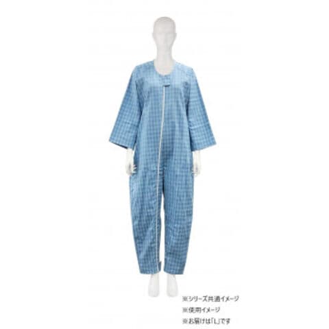 ご本人では開けにくいアイデアホックを使用した介護用つなぎねまき。アイデアホックが表から見えないデザインを採用しています。縫い目が丈夫で、洗濯にも強い折り伏せ縫い。首元から右足首にかけて開き、股部分も開閉可能です。(※フドーねまきは、おむつ・おむつカバーを使用して着用することを想定しています。)
