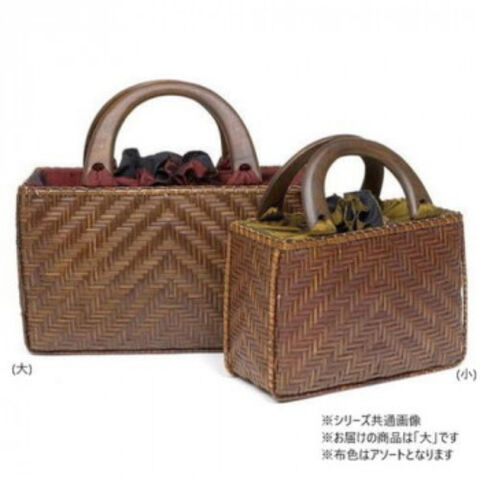 | 持ち手に木材を使用したアジロ編みのバッグです。 |