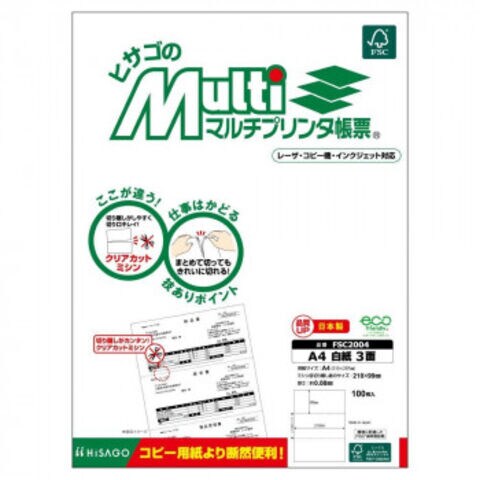 ヒサゴ マルチプリンタ帳票 A4 白紙 3面 100枚 FSC2004