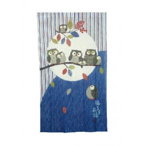 | 枝で休むふくろうたちが可愛らしいのれんです。生地に防炎加工を施してありますので、燃え広がり難く万が一の時にも安心です。 ※ポールは付属しません。 |