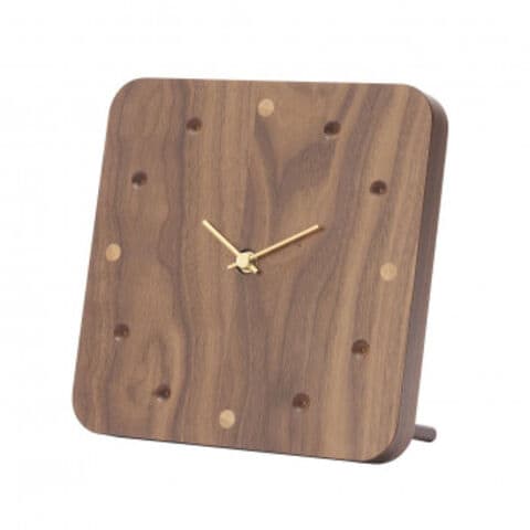 1枚の木を贅沢に使った、ウォールナット製の時計です。象嵌と彫りで12個の目盛りを表現しています。置き時計にもなるスタンド用バー2本付属。ムーブメントはセイコータイムクリエーション製。