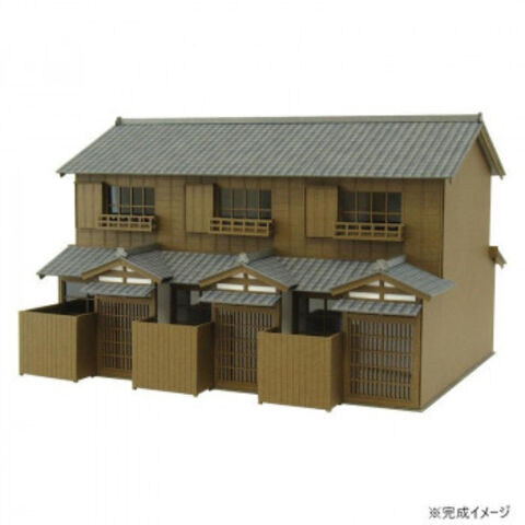 | 木造2階建ての三軒長屋のキットです。背面はスッキリした造りになってますが、正面から見るとボリューム感があります。 ※みにちゅあーとキットはキット商品です。完成品ではございません。 |