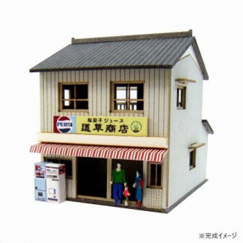 | 駄菓子屋さんのキットです。シンプルな外観で、紅白の庇がかわいいです。物干し台、自動販売機(2個)も付いています。 ※みにちゅあーとキットはキット商品です。完成品ではございません。 |