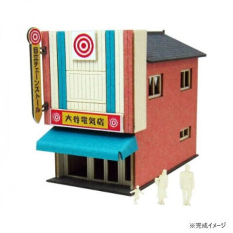 | 電気屋さんのキットです。町中にありそうな看板建築の電気屋さん。白、水色、茜色のストライプがいい感じです。大きな袖看板や、建物を並べた時にチラッと見える壁面の茜色もいいです。おまけで人形3体が付いています。人形はカラーペンで着色がオススメです。 ※みにちゅあーとキットはキット商品です。完成品ではございません。 |