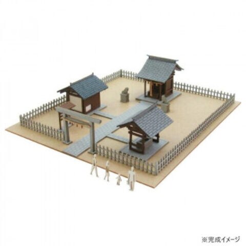 小さな神社のキットです。流れ造りの一間本殿とその他神社に必要なアイテムを揃えました。あえて拝殿は設けず賽銭箱は本殿に付属する形になっています。おまけで人形4体が付いています。人形はカラーペンで着色がオススメです。