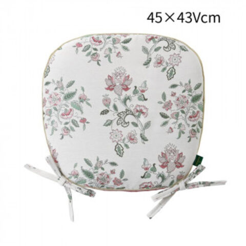 インテリアに合わせやすいオフホワイトのグランドに、陶磁器カップのデザインをそのまま落とし込んだような、ピンクのダイニングシートクッション。椅子に縫い付けの紐でしっかりと固定して使えて、木製椅子の座面に座った際のひんやり感や固さを軽減し、椅子全体のクッション性を補え、やわらかな座り心地になります。