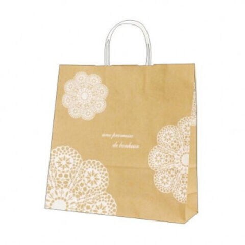 | 衣料・雑貨店など幅広く利用される、柄入りの手提げバッグです。人気のレース柄をナチュラルな風合いの未晒クラフト紙に白刷り印刷しています。ガーリーで落ち着いたデザインなので幅広い層に好まれます。原紙の質感を生かしたナチュラルな風合いの未晒クラフト素材。底のマチ幅が広いので厚みのある商品を入れるのに適しています。une・promesse・de・bonheurは幸せな約束という意味です。 |