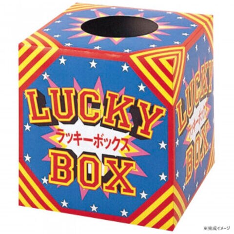 | 紙製の組み立て式抽選箱です。イベントにぴったりのデザインで「ラッキーボックス」の文字入りです。 ※現品は組立加工しておりません。 |
