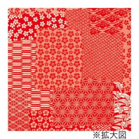 | 目を引く和風柄の包装紙です。赤の千代紙を貼り合わせたラッピングしやすい柄です。年配の方に好まれるデザインで、和の雰囲気を生かし幅広いシーンでお使いいただけます。一般的な半才サイズです。 |