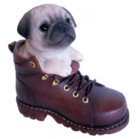 | 靴にすっぽりはまっている、可愛いパグの置物です。 |