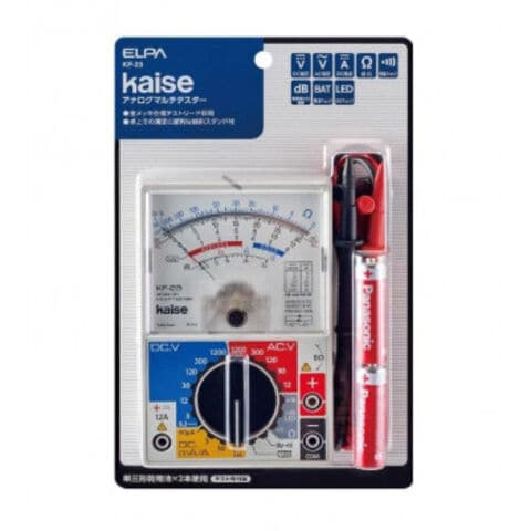 | 仕様 | 直流電圧:0.3/3/12/30/120/300/1200V 交流電圧:12/30/120/300/1200V 直流電流:60μ/3/30/600m/12A 抵抗:×1(5kΩ)/×10(50kΩ)/1K(5MΩ) 導通試験:約50~1kΩ以下でブザー 電池チェック:1.5V 低周波出力:-10~2331435163dB LEDチェック |