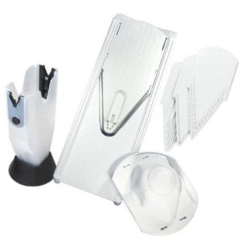 | セット内容 | 本体 ブレードガード(裏面3.5mmスライス部品) 薄厚切り部品 ※薄切り2mm&厚切り5mm 1.6mm千切り部品 3.5mm千切り部品 ブレードケース V4安全ホルダー ※厚さは力加減によって多少変わります。表記厚さのおよそ0.5mm前後とお考えください。 |
