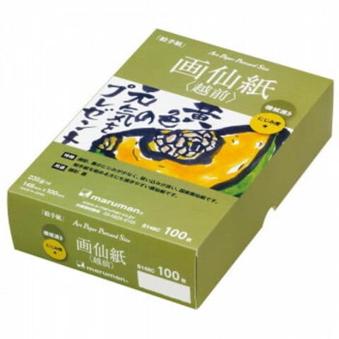 国産画仙紙(越前)は、福井県越前市で抄造された画仙紙です。手漉きの風合いを持たせ、簀の目も深く入ったソフトな表面です。墨や顔彩の吸い込みも良く、その色が忠実に再現できます。絵手紙をはじめる方にも描きやすい紙です。