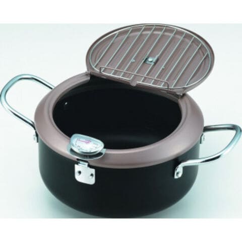 深型設計で油ハネを抑えます。フタ裏がバットになっており機能面を重視。温度計付で揚げ頃チェックが容易です。