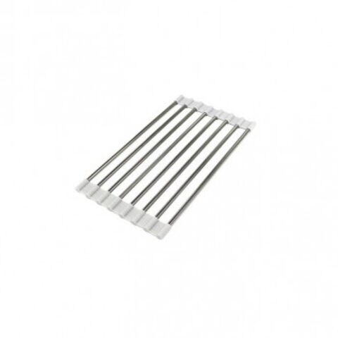 | シンクに渡して水を切ることができるラックです。本体はステンレス製で錆びにくいため水まわりに適します。伸縮させることができ、シンクの幅に合わせて調節できます。フチはシリコン製のため滑りにくくシンクのフチにフィットします。使わないときは巻簾状にできるのでコンパクト。 |