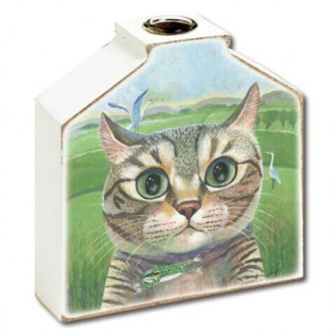 | 愛らしいねこ達をユニークなカタチの木製ベースのシェイプに合わせてプリントした、ナチュラルなアートのフラワーベース。 |