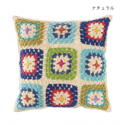 | ハンドメイドのクロシェ編みが温もりを感じるクッションカバーです。気分が上がる配色でお部屋のアクセントに! |