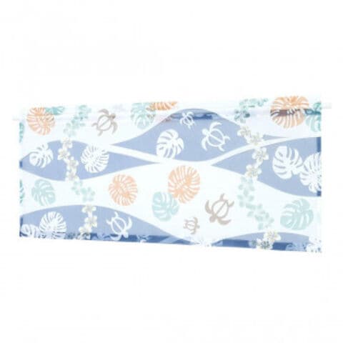 | ホヌ、モンステラ、レイをモチーフにしたハワイアンなカフェカーテンです。爽やかなカラーが涼しげで、オパール加工によりポリエステルの部分だけを残して透かし柄を描いているので、光に透けて映し出される影もとてもキレイです。 |