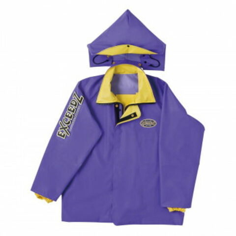 PVC水産用合羽です。袖の「EXCEEDZ」マークがポイント。もちろんプロも納得の造りです。前開きから水が入りにくい前立二重構造と袖口から水が入りにくい二重袖を採用。