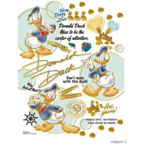 | 色彩とグラデーションの箔表現をお楽しみいただける「カラフル・ゴールド」シリーズに短気だけど、どこか憎めない「ドナルドダック」が登場!恋人のデージーダックや甥っ子のヒューイ、デューイ、ルーイのシルエットもデザインされた絵柄を是非お楽しみください。 |