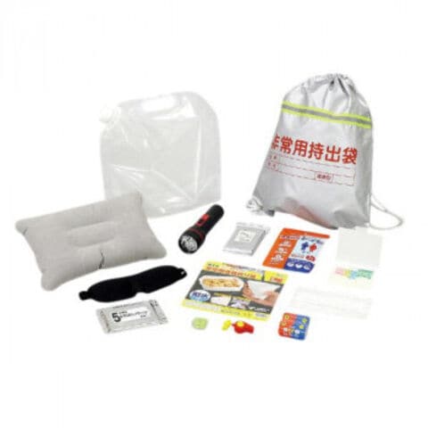 | 枕入りで一泊可能なセットです。難燃性のナップサックタイプなので、万一の火事の際にも荷物を守ります。 |