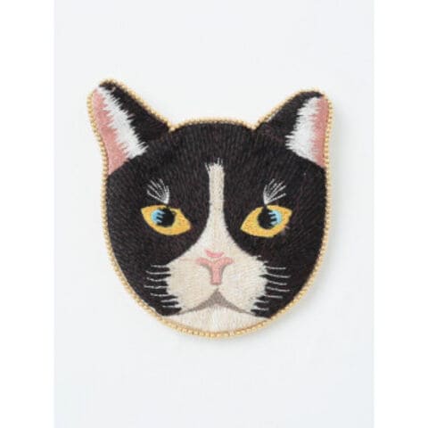 光沢のあるポリエステル生地に猫のモチーフが刺繍されたポーチです。フェイスラインにはビーズがあしらわれています。