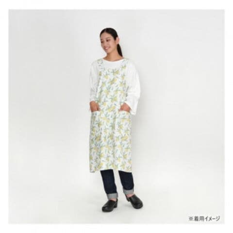 | レモン柄がおしゃれなロングエプロンです。左右にポッケが付いているので、小物を入れておけます。 |