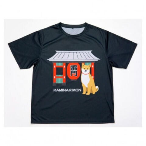 | 雷門と柴犬がプリントされたTシャツです。ユニークなデザインが魅力的です。 |