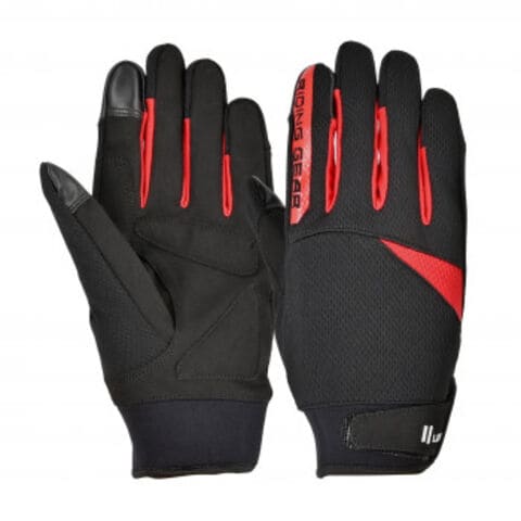 グローブを装着したままスマートフォンやタブレットの画面操作が可能です。手の甲部分には通気性の良いメッシュ素材を使用し、伸縮性が良くぴったりとフィットします。袖口は締め付け調節が便利なベルクロ式です。手の平部分は薄手で柔らかい合皮製なので、グリップが握りやすくレバー操作も妨げず、メンテナンスも簡単です。