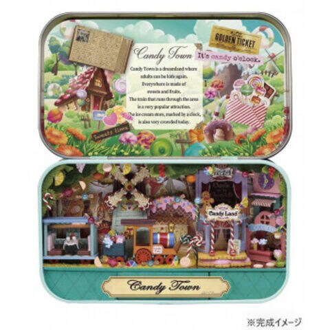 | いたるところがお菓子で出来ています。小さなパーツをカッターやはさみで切ったり、付属の接着剤で貼りつけたりしながら、缶の中に小さな世界を作るというミニチュア・ハンドメイド・キットです。 |