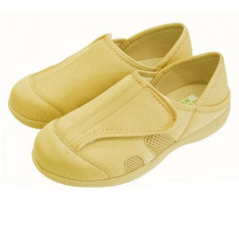 | 病院や施設内での上履きなど履きやすいシューズとして、かかとを踏めばサンダル(スリッパ)として。シューズのかかと部分を踏むとその部分が倒れてスリッパの様に履くことができます。脱ぎ履き簡単なマジックテープ付。つま先が反り返った構造で、つまずきにくくなっています。 |