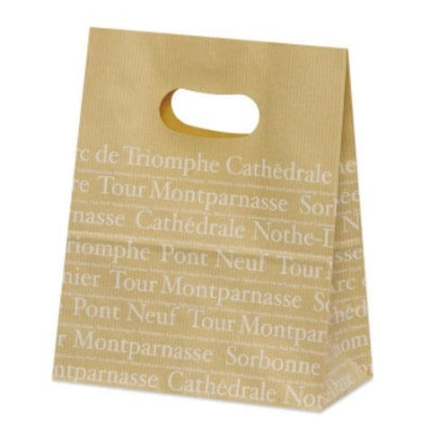 | 持ち手部分に丸く穴があいた手穴タイプの手提げ袋「イーグリップ」。ナチュラルなスジ入りの紙にフランス語をデザインした「フランセ」は洋菓子やパン、カフェのテイクアウトランチやお惣菜などさまざまなご用途に人気です。 ※食品をいれる際には個包装してからご利用ください。 |