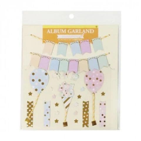 | ガーランドや風船をモチーフに、楽しい雰囲気のデコレーションアイテムです。ゆらりと揺れるメッセージ付きガーランドをアルバムの表紙や台紙に貼ると、特別感たっぷりなアルバムに仕上がります。ガーランドに好きなメッセージを書き込めます。 |