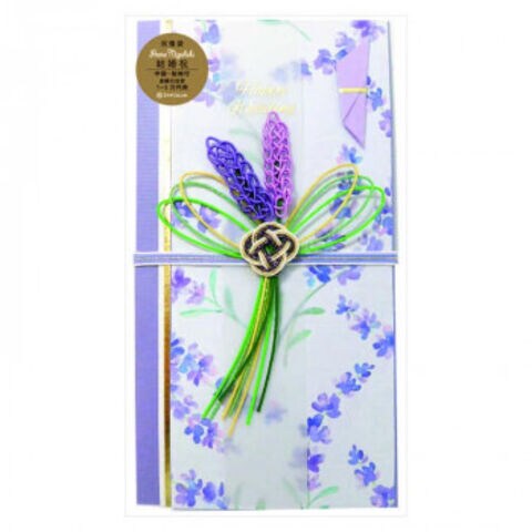 | ラベンダーをイメージした水引が印象的な金封。全面に印刷された花は水彩画タッチで優しい雰囲気になります。HappyWedding、寿、御結婚御祝、無地の短冊4枚入り。HappyWeddingが箔押しされた短冊のみトレーシングペーパー素材になっています。中袋付き。金額の目安は1~5万円用。 |