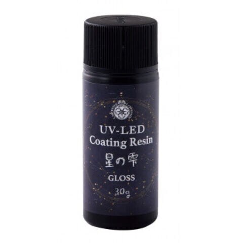 コーティング専用レジン液。硬化が早く、硬い仕上がりで、硬化後のベタつきがない。ガラスのような透明度と輝きを与えるグロスタイプ。