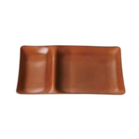落ち着いたブラウンの表面に黒の裏塗り仕上げで高級感を演出し、和洋問わず多用途に使えるシンプルな2点仕切りプレートです。割れにくく丈夫で業務用飲食店や家庭用に適しています。
