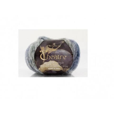 | 単色と5色プリントの2種類のウール・アルパカスライバーを、度目の粗いナイロンリリヤーンに同時に吹き込み、空気の渦の中を通して表面の起毛をロービング風に巻きつけた糸です。スライバーを吹き込む際に量に変化をつけて、太い部分と細い部分をつくり、ロービングスラブ風に仕上げています。色はパリの劇場空間に見られる色彩を表現しました。 |