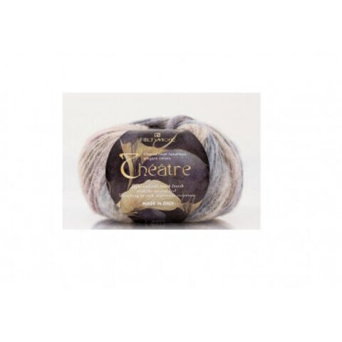 単色と5色プリントの2種類のウール・アルパカスライバーを、度目の粗いナイロンリリヤーンに同時に吹き込み、空気の渦の中を通して表面の起毛をロービング風に巻きつけた糸です。スライバーを吹き込む際に量に変化をつけて、太い部分と細い部分をつくり、ロービングスラブ風に仕上げています。色はパリの劇場空間に見られる色彩を表現しました。
