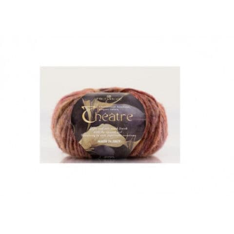 | 単色と5色プリントの2種類のウール・アルパカスライバーを、度目の粗いナイロンリリヤーンに同時に吹き込み、空気の渦の中を通して表面の起毛をロービング風に巻きつけた糸です。スライバーを吹き込む際に量に変化をつけて、太い部分と細い部分をつくり、ロービングスラブ風に仕上げています。色はパリの劇場空間に見られる色彩を表現しました。 |