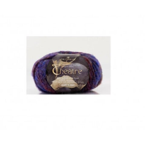 | 単色と5色プリントの2種類のウール・アルパカスライバーを、度目の粗いナイロンリリヤーンに同時に吹き込み、空気の渦の中を通して表面の起毛をロービング風に巻きつけた糸です。スライバーを吹き込む際に量に変化をつけて、太い部分と細い部分をつくり、ロービングスラブ風に仕上げています。色はパリの劇場空間に見られる色彩を表現しました。 |
